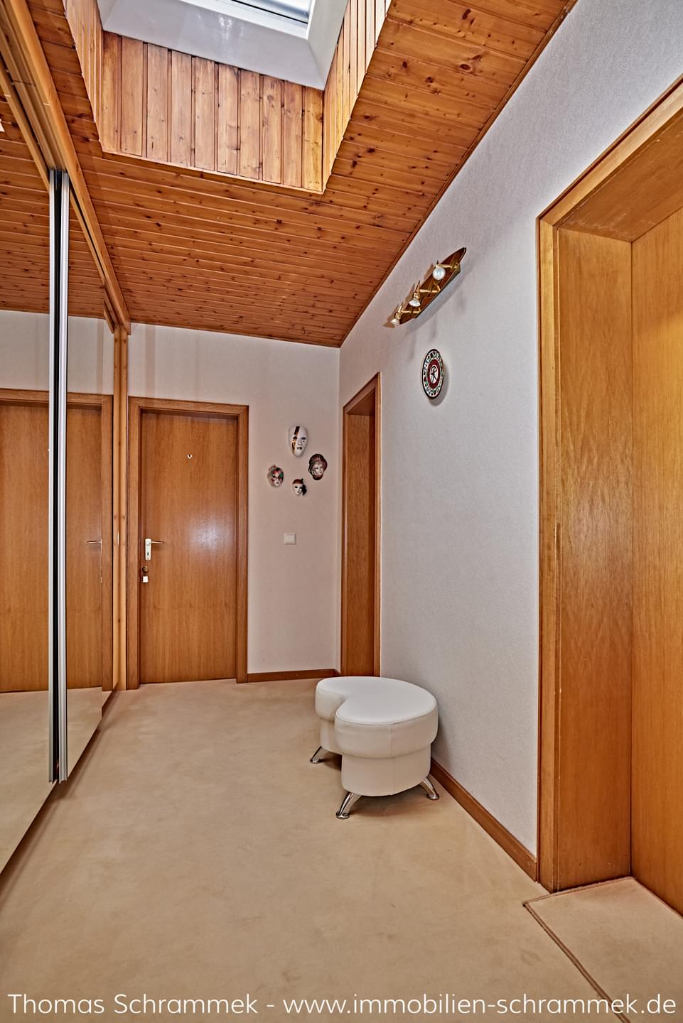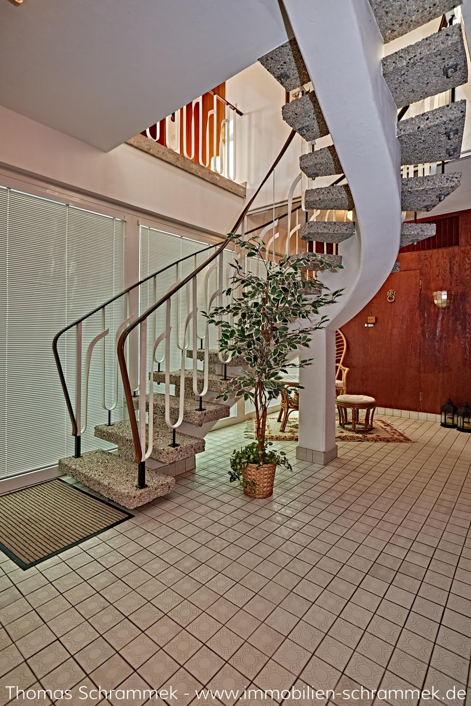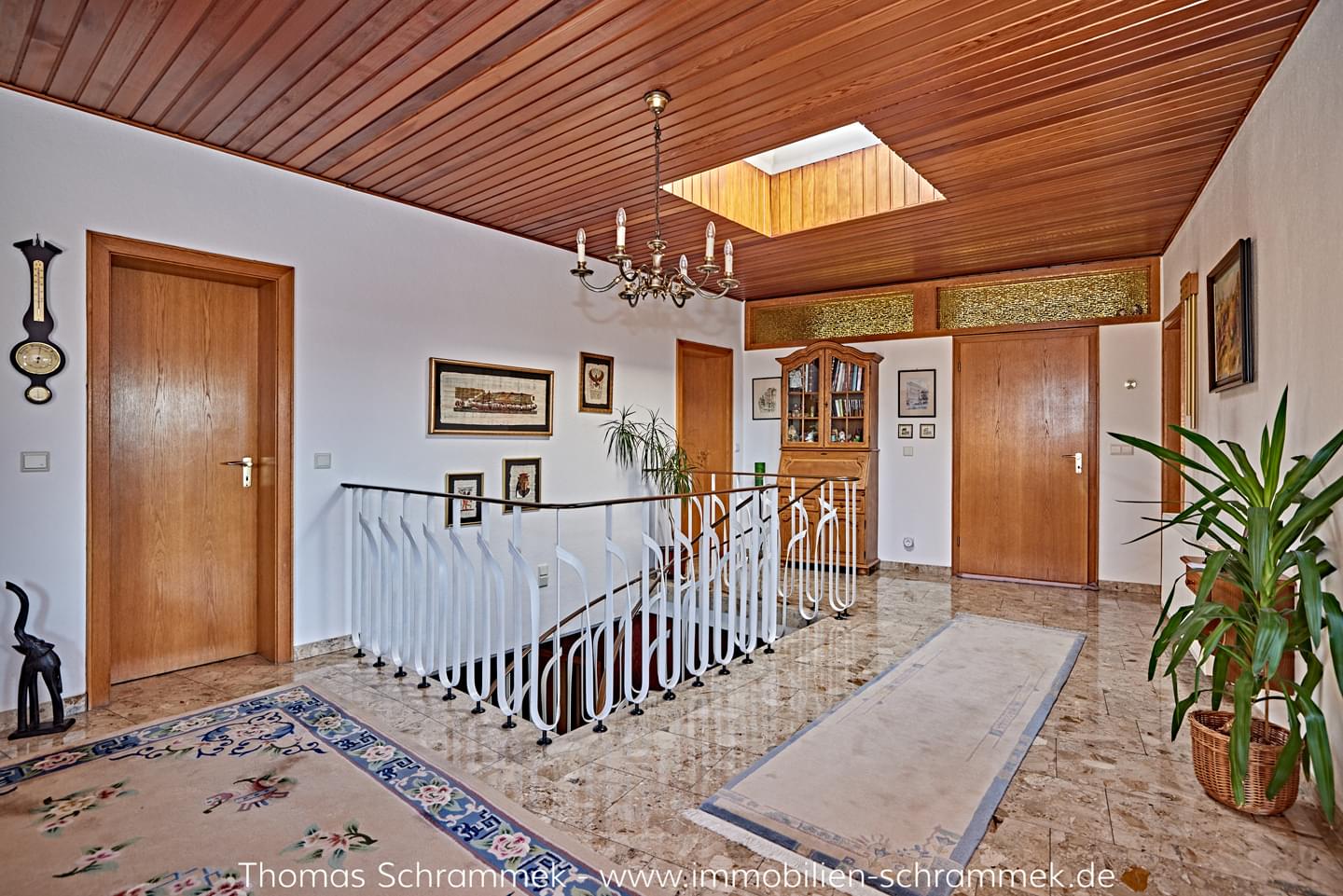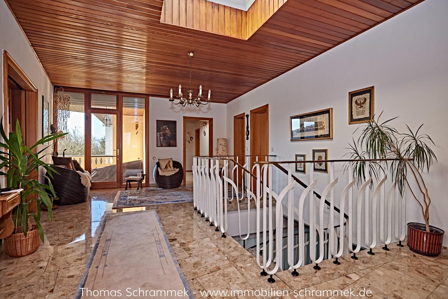 - Diele: Über einen Windfang mit praktischer Garderobe betreten Sie die großzügige und repräsentative Diele, die als zentraler Verteiler des Hauses fungiert. Von hier aus gelangen Sie nicht nur in die verschiedenen Wohnbereiche, sondern auch auf den Balkon sowie über eine elegante Wendeltreppe direkt ins Untergeschoss.