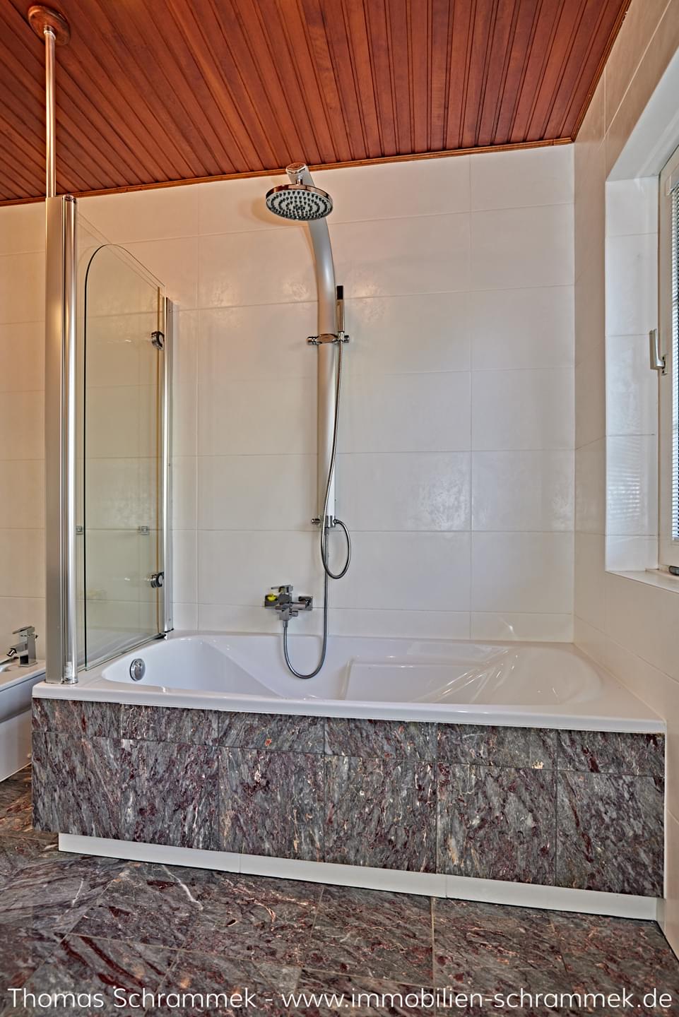 - Badezimmer 1: Das Tageslichtbad ist mit Badewanne und Duschmöglichkeit, Bidet und separater Toilette ausgestattet. Hochwertige Materialien wie Naturstein und zeitlose weiße Fliesen unterstreichen den gepflegten Zustand.