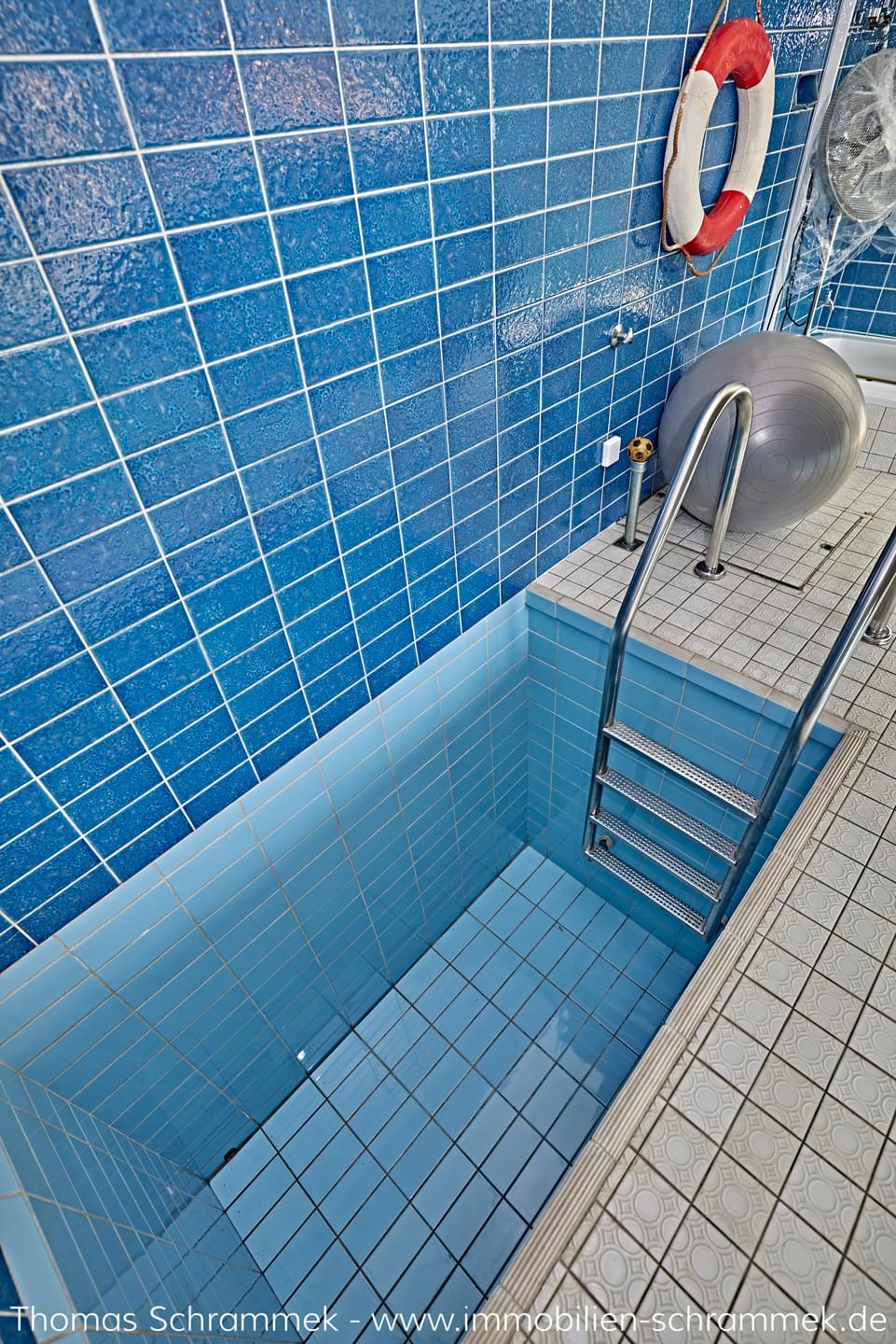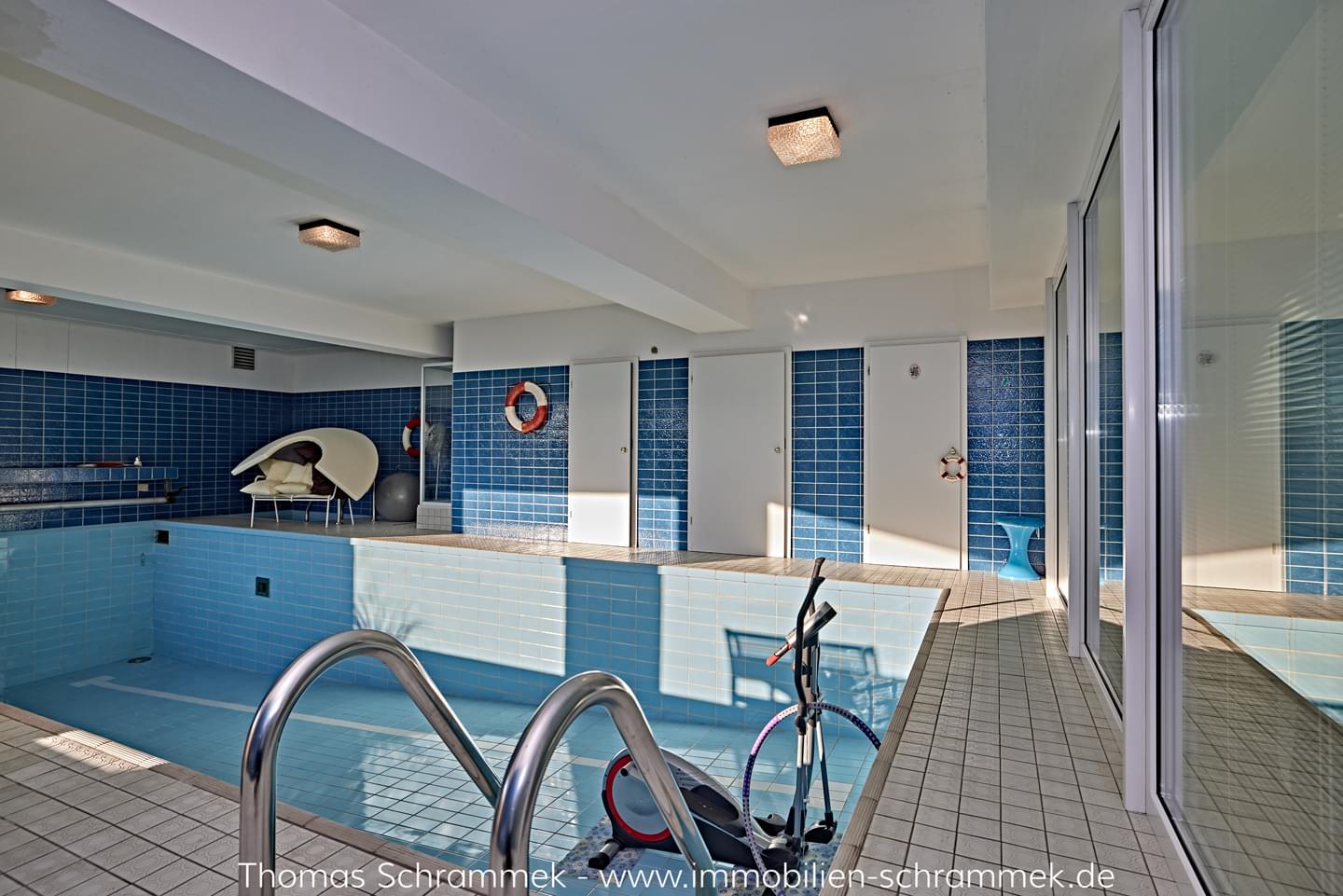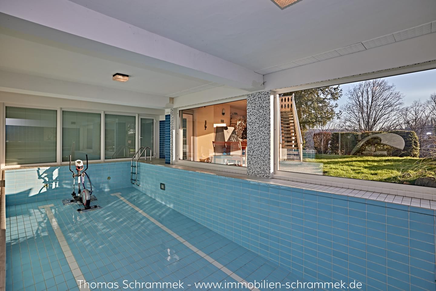 - Schwimmhalle: Dieser großzügige Raum mit großer Fensterfront, angrenzendem WC und Dusche bietet vielfältige Nutzungsmöglichkeiten. Derzeit außer Betrieb, könnte das Schwimmbecken entweder reaktiviert oder der Raum alternativ als Fitnessbereich, Hobbyraum oder Atelier genutzt werden. Ein direkter Zugang führt auf die geschützte Terrasse mit Außenkamin und weiter in den Garten. Darüber hinaus wäre bei Bedarf auch ein Umbau zu einer Einliegerwohnung denkbar – ideal für ein erwachsenes Kind, Angehörige oder eine Nutzung als Büro oder Praxis.