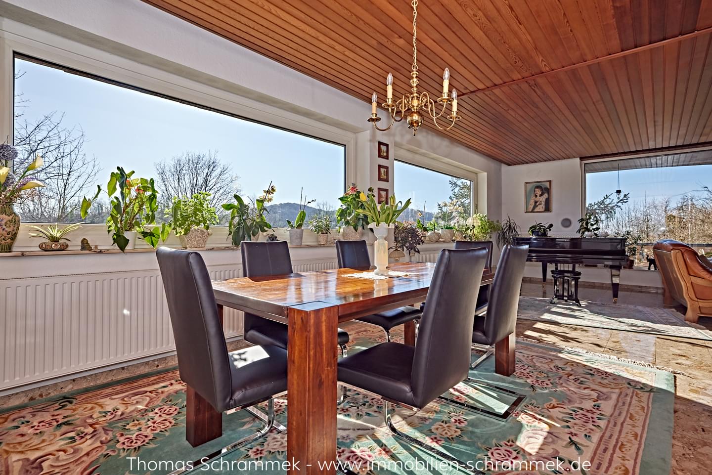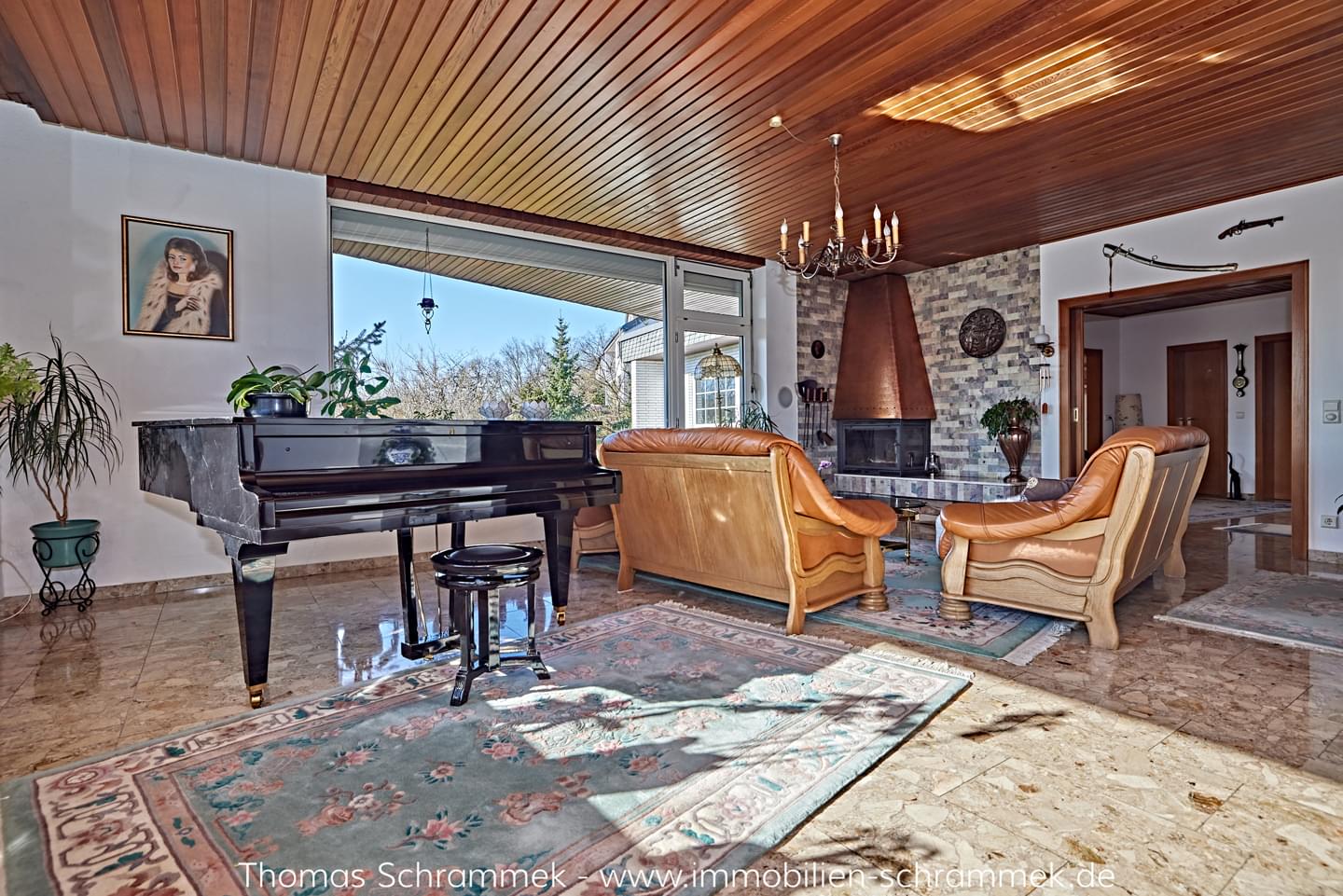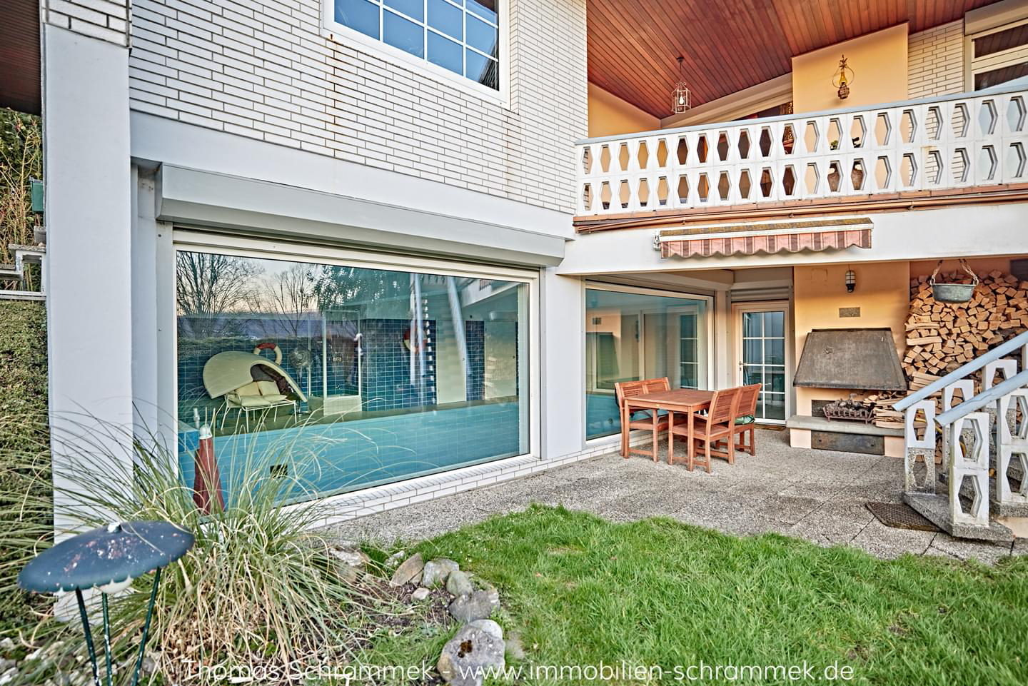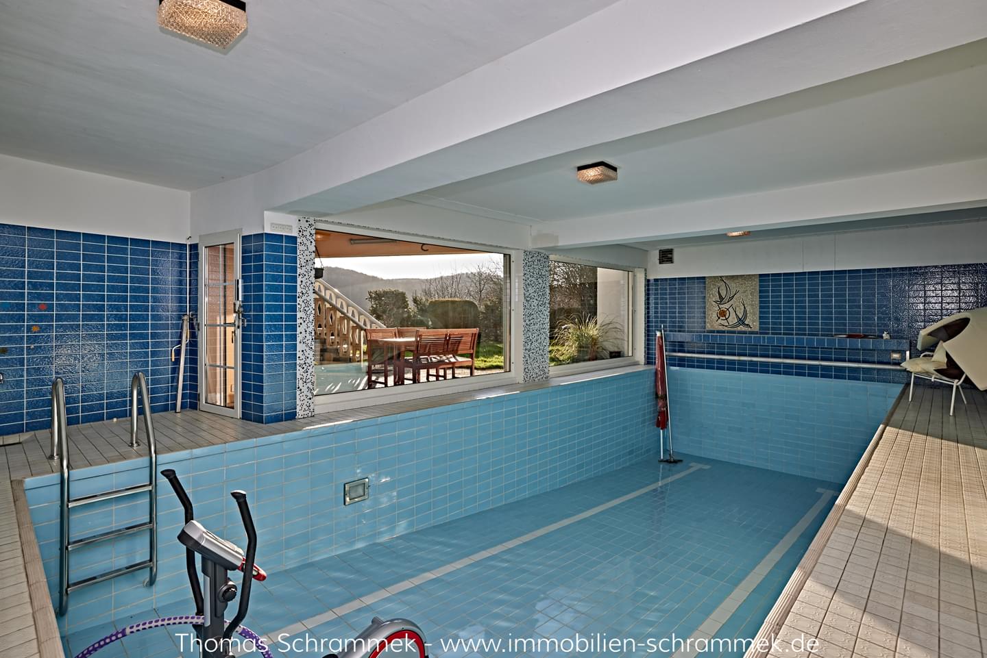 - Schwimmhalle: Dieser großzügige Raum mit großer Fensterfront, angrenzendem WC und Dusche bietet vielfältige Nutzungsmöglichkeiten. Derzeit außer Betrieb, könnte das Schwimmbecken entweder reaktiviert oder der Raum alternativ als Fitnessbereich, Hobbyraum oder Atelier genutzt werden. Ein direkter Zugang führt auf die geschützte Terrasse mit Außenkamin und weiter in den Garten. Darüber hinaus wäre bei Bedarf auch ein Umbau zu einer Einliegerwohnung denkbar – ideal für ein erwachsenes Kind, Angehörige oder eine Nutzung als Büro oder Praxis.