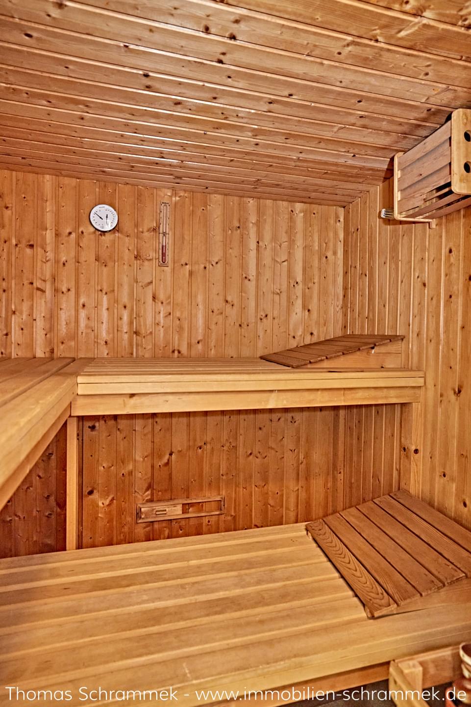 - Sauna: Die voll funktionsfähige Sauna ergänzt das Raumangebot um einen komfortablen Rückzugsort zur Entspannung im eigenen Zuhause. Sie ist räumlich so angeordnet, dass sie auch bei einer Umgestaltung der Schwimmhalle weiterhin problemlos genutzt werden kann.