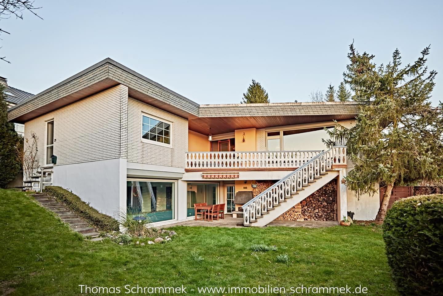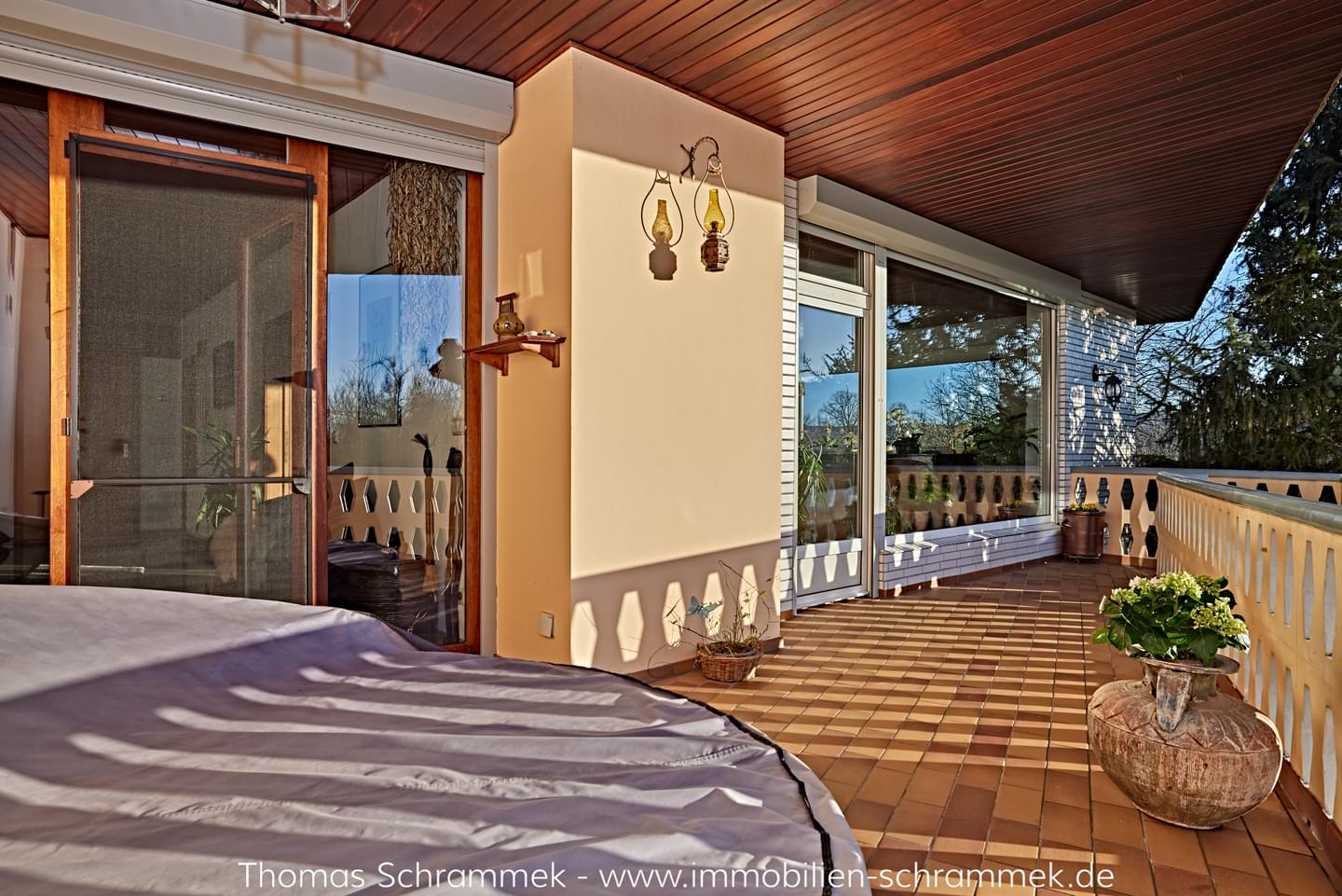 - Balkon: Vom Wohnbereich und der Diele aus begehbar, lädt der große Balkon zum Entspannen mit schöner Aussicht ein. Eine Treppe führt direkt hinunter zum Garten und zur unteren Terrasse.