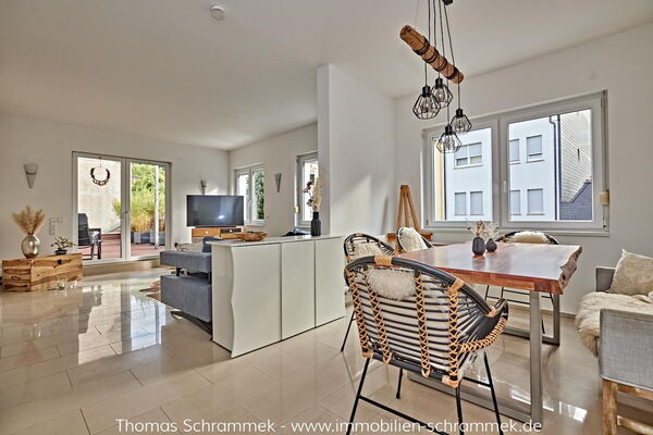 - Wohn- und Essbereich: Dieser offen gestaltete Bereich bildet das Herzstück der Wohnung. Dank großer Fensterflächen ist der Raum lichtdurchflutet und schafft eine angenehme Wohnatmosphäre. Der Essbereich schließt direkt an die Küche an und bietet genügend Raum für einen großen Tisch – ideal für gemeinsame Mahlzeiten.
