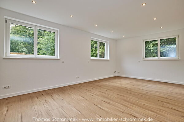 - Wohn-Esszimmer: Dieser Raum ist das Herzstück der Wohnung und beeindruckt durch seine Großzügigkeit und Helligkeit mit Blick ins Grüne. Die offene Gestaltung hin zur Küche macht ihn ideal für gesellige Zusammenkünfte mit Familie und Freunden. Hier finden sowohl ein gemütlicher Wohnbereich als auch ein großzügiger Essplatz ihren Raum. Große Fenster lassen viel Tageslicht herein, wodurch eine freundliche und einladende Atmosphäre entsteht.