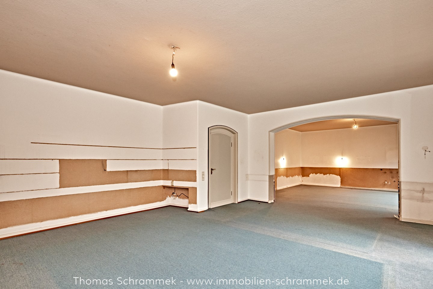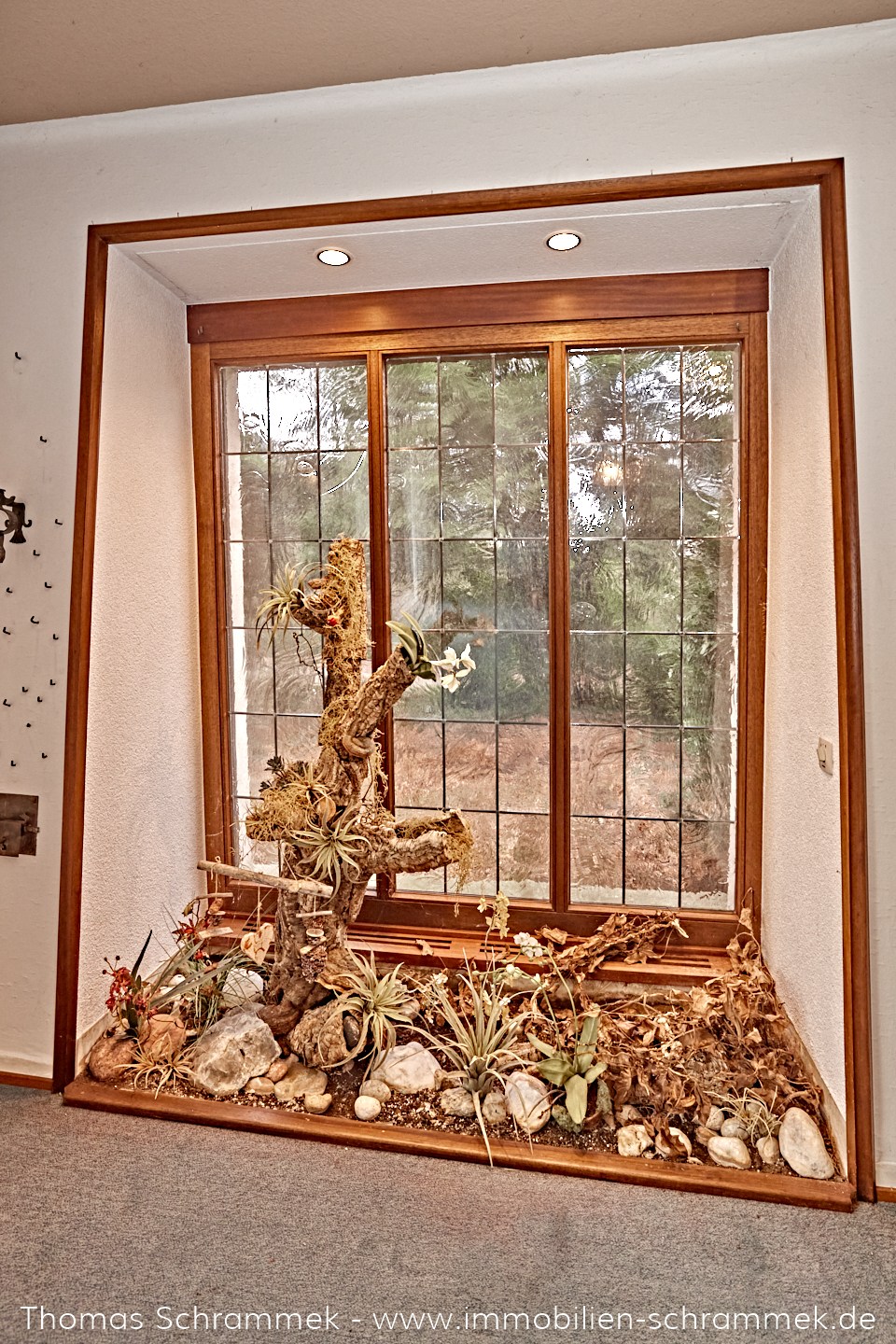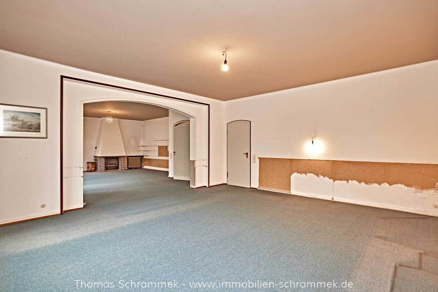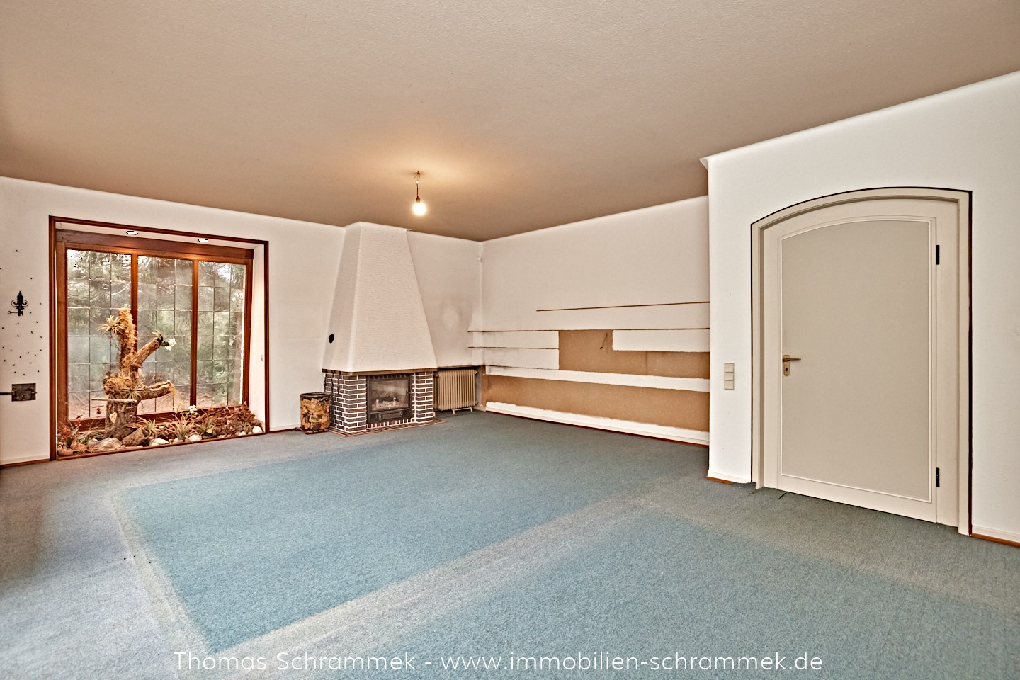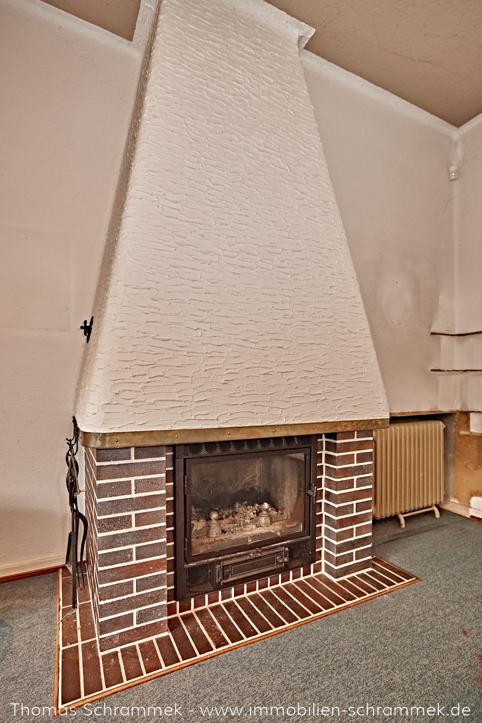 - Wohn-Esszimmer: Offen miteinander verbunden, bilden Wohn- und Essbereich das Herzstück des Hauses. Große Fensterfronten eröffnen einen wunderbaren Ausblick in den Garten und führen direkt auf die Terrasse. Ein gemauerter Kamin sorgt an kühleren Tagen für eine behagliche Atmosphäre. Die großzügige Raumstruktur bietet die Möglichkeit hier eine gemütliche Leseecke einzurichten, mit Blick ins Grüne und in wohliger Nähe zum Kamin.
