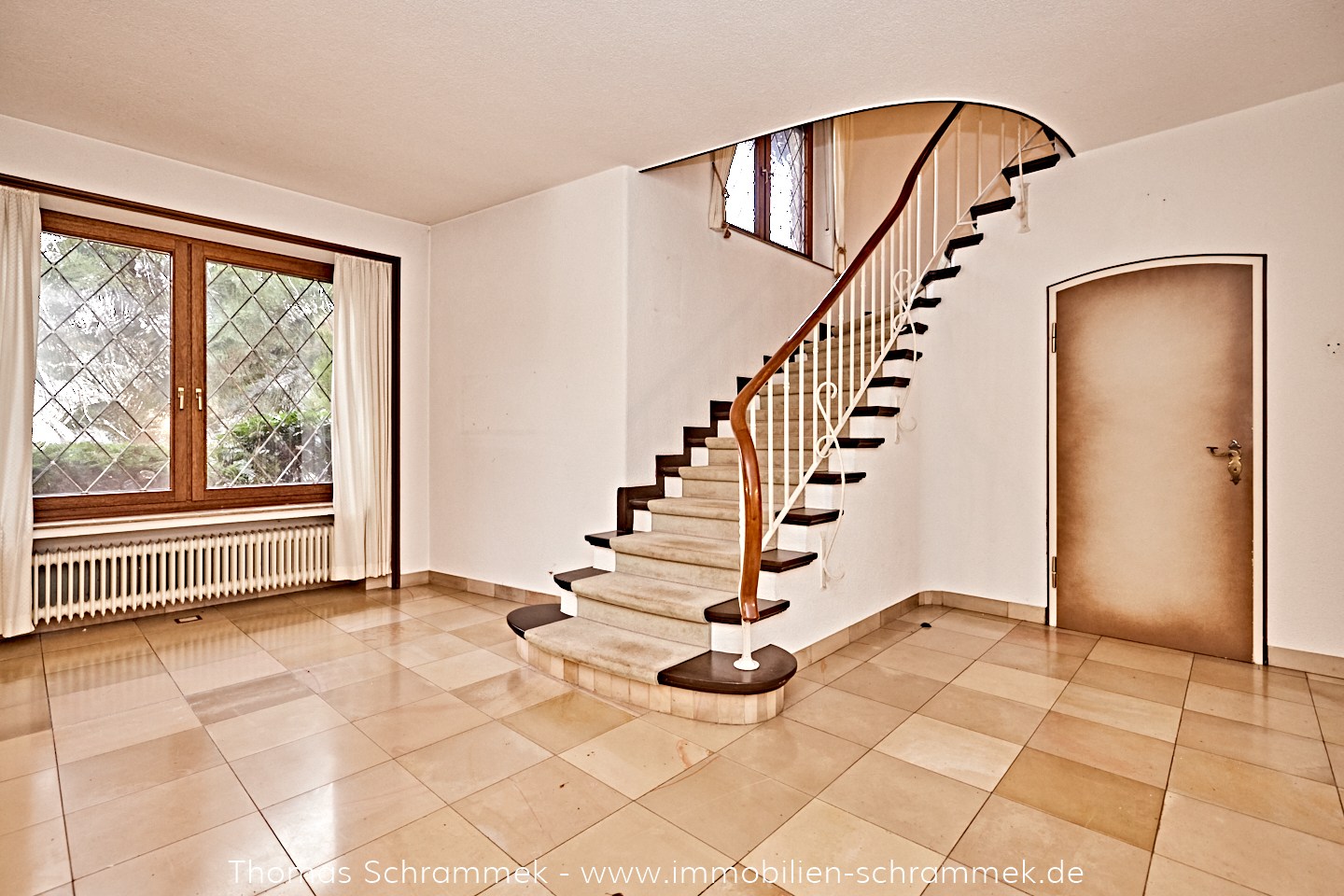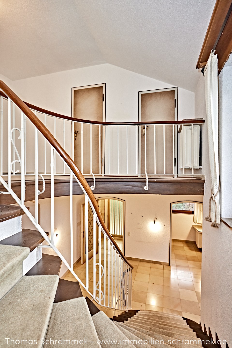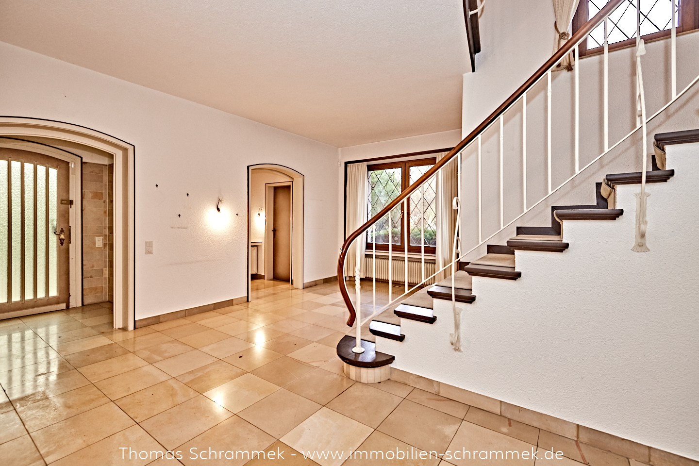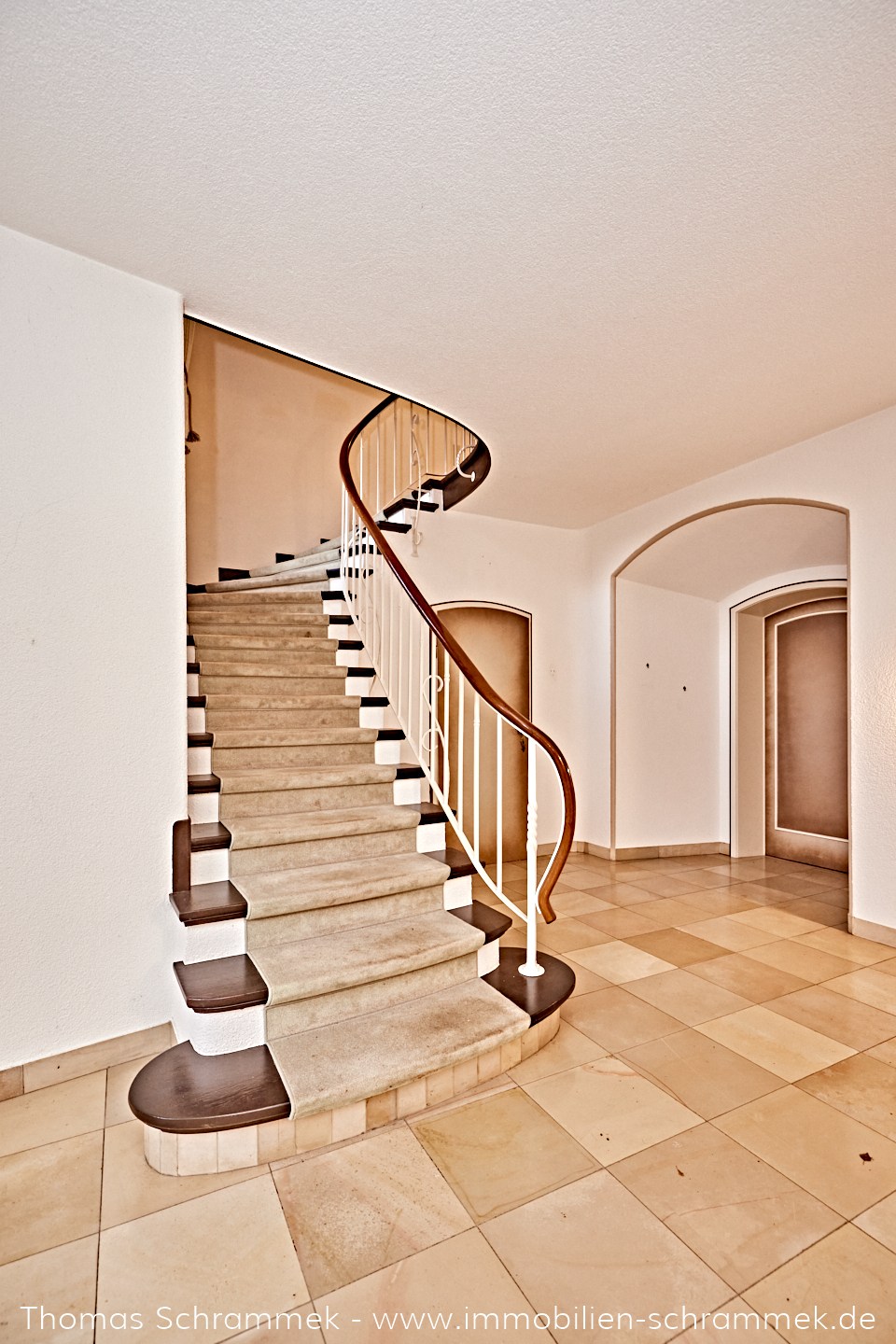 - Diele: Bereits beim Eintreten empfängt Sie eine großzügige Diele mit eindrucksvoller Raumwirkung. Die elegant geschwungene Treppe ins Obergeschoss setzt dabei ein architektonisches Ausrufezeichen und verleiht dem Eingangsbereich eine besondere Präsenz.