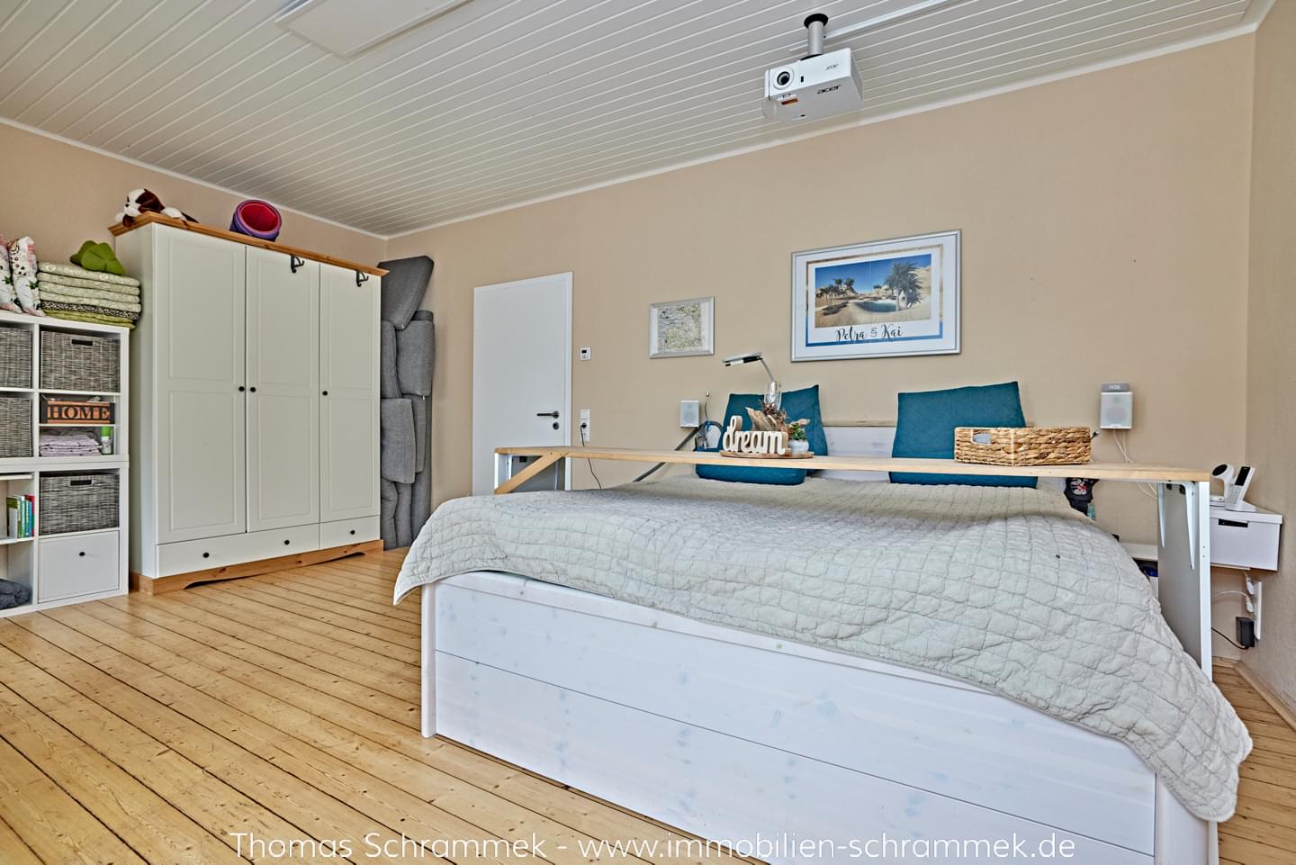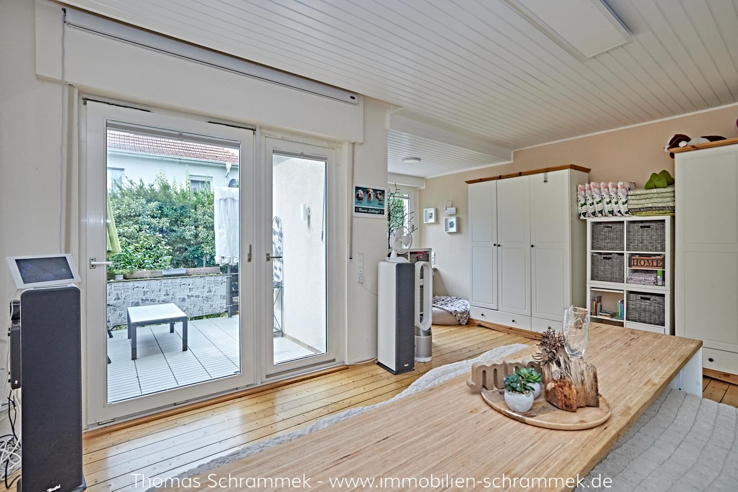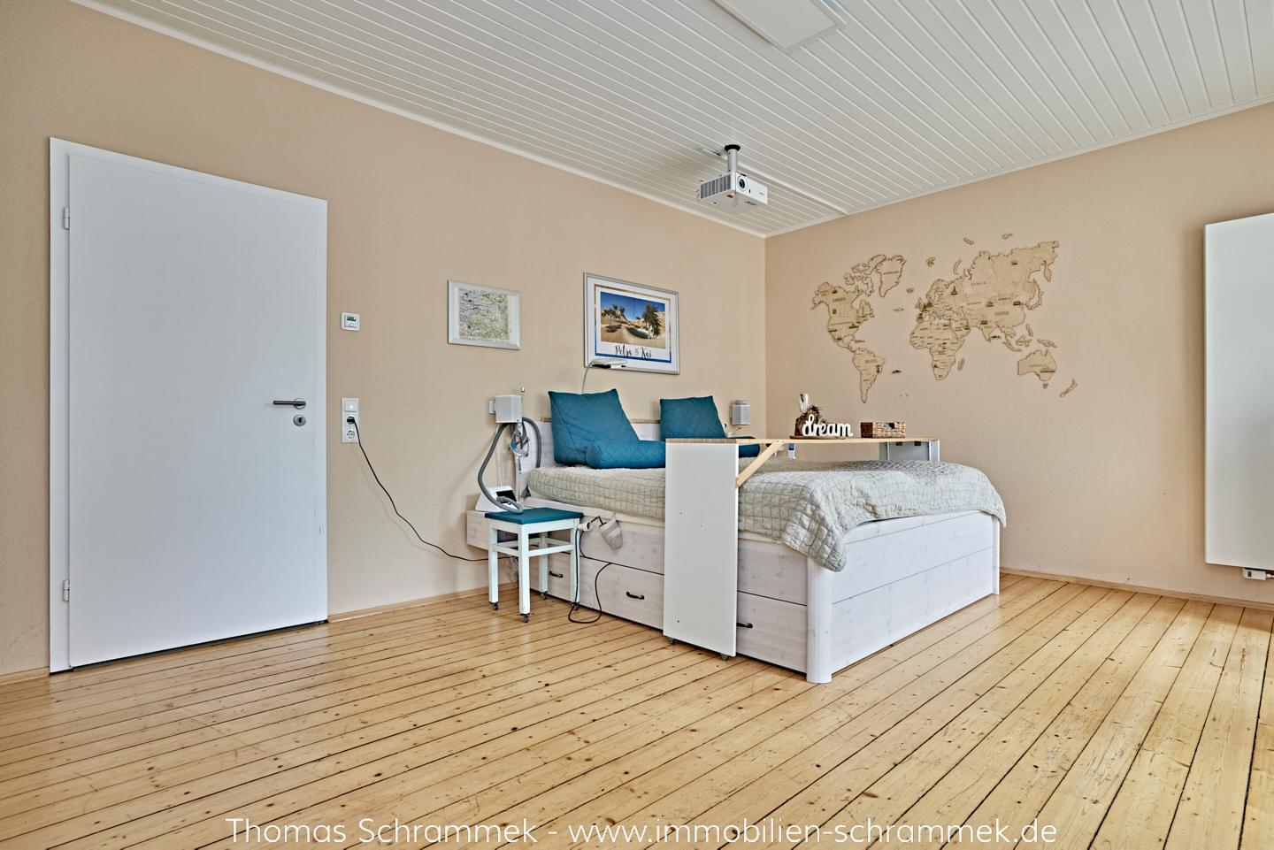 - Schlafzimmer (oder Wohnzimmer): Ruhig zum Garten hin gelegen, schafft dieser großzügiger Raum eine entspannte Rückzugsoase mit Zugang zur Terrasse. Klassisch ist hier ein schönes Wohn-Esszimmer mit Ausgang zur Terrasse und dem Garten umsetzbar.