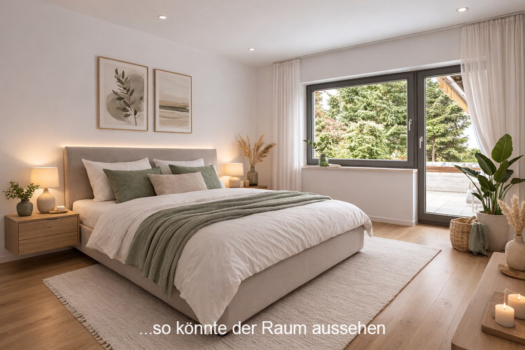 - Schlafzimmer: Das großzügige Schlafzimmer lädt als ruhiger Rückzugsort zum Entspannen ein und bietet ausreichend Platz für ein komfortables Doppelbett sowie großzügige Schranklösungen. Ein direkter Ausgang auf die Terrasse verbindet den Raum harmonisch mit dem Außenbereich.