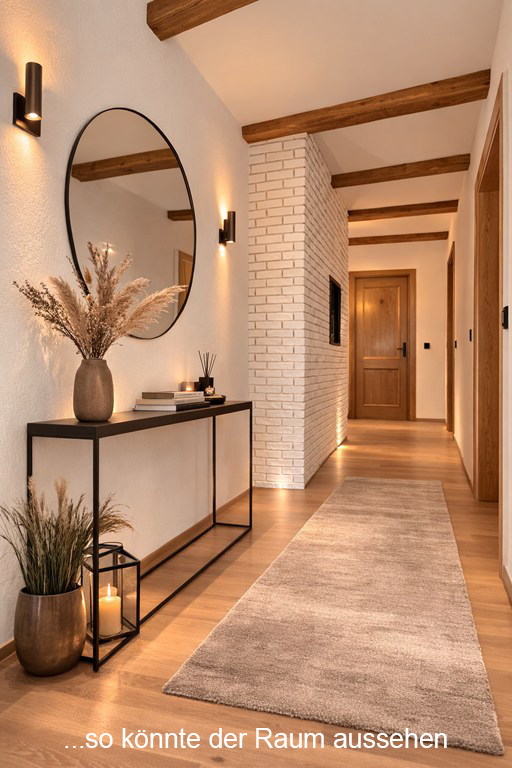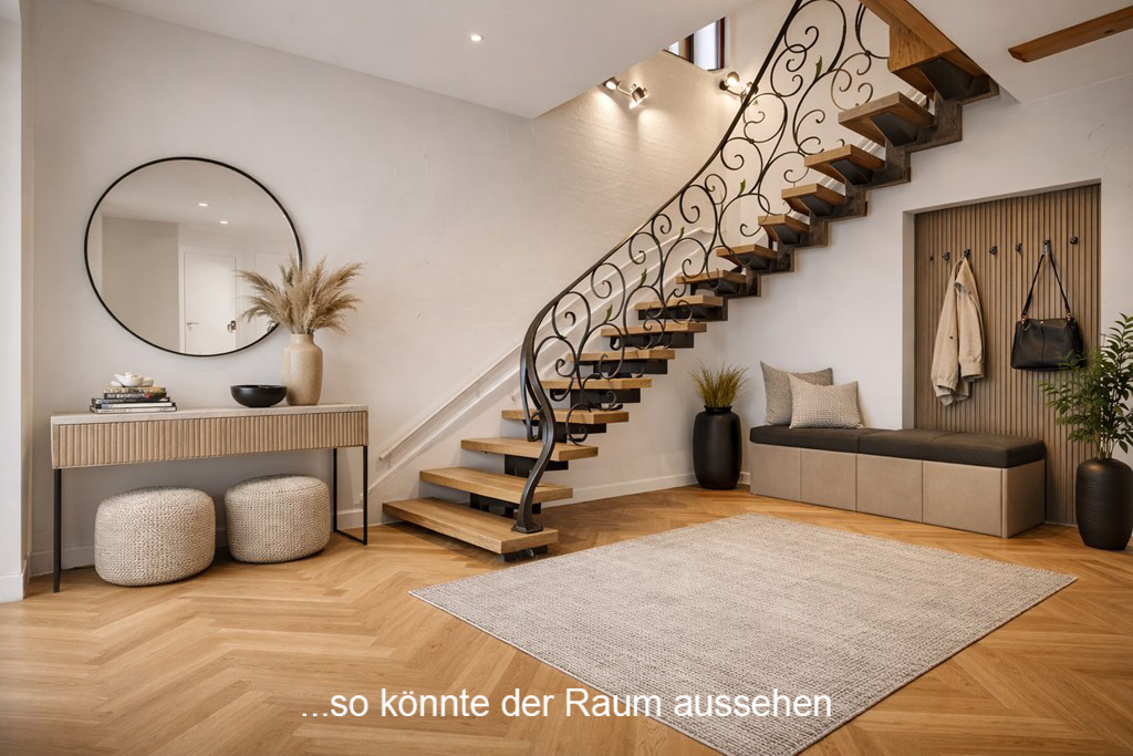 - Empfangsdiele mit Treppenaufgang: Beim Betreten des Hauses werden Sie von einer geräumigen Diele empfangen, die mit ihrer Großzügigkeit und dem wohnlichen Charakter sofort einladend wirkt; eine elegante Treppe, die sich harmonisch in den Raum einfügt, führt von hier aus stilvoll ins Erdgeschoss und verleiht dem Eingangsbereich eine repräsentative Note.