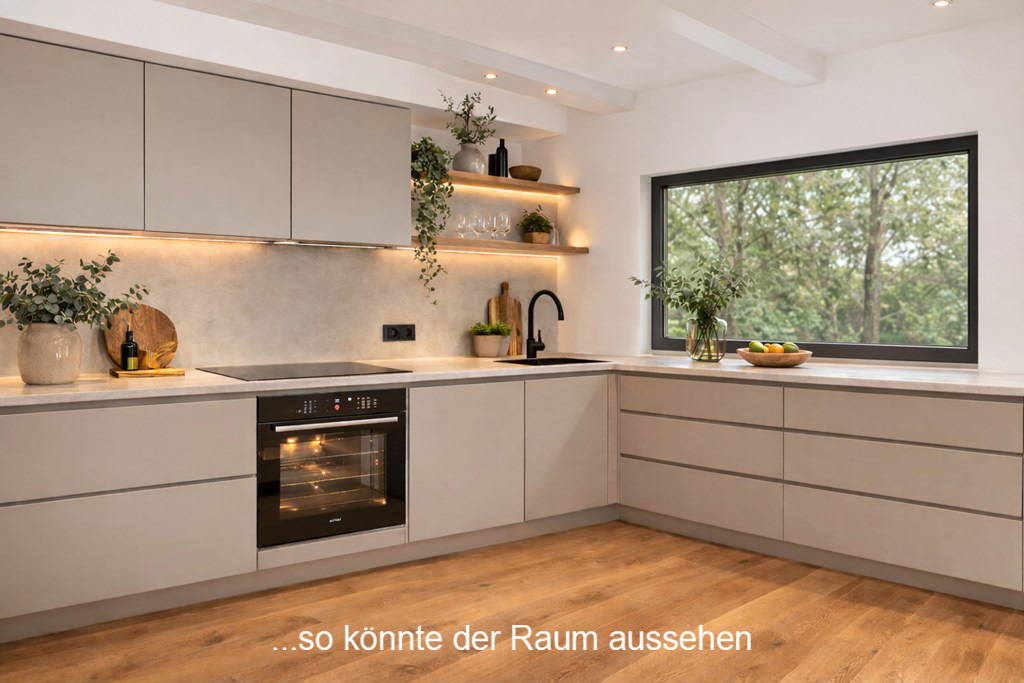 - Küche: Die separate, gut proportionierte Küche überzeugt mit großzügiger Arbeitsfläche, viel Stauraum für alle Küchenutensilien und einem Essplatz für die Mahlzeiten im Alltag. Durch das helle Ambiente ist der Raum besonders freundlich und einladend – ein Ort, an dem Kochen zum gemeinsamen Erlebnis wird.