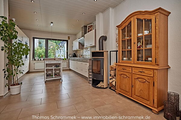 Über einen Windfang gelangen Sie in den Flur des Hauses. Von hier haben Sie Zugang zu dem Dachgeschoss, dem Kellergeschoss sowie einem im Erdgeschoss gelegenen Schlafraum. Der Flur führt Sie außerdem geradewegs in die großzügig angelegte Wohnküche, die den Mittelpunkt des Familienlebens bildet. Der Blickfang hier ist zweifelsohne die moderne und gut ausgestattete Einbauküche mit ihren weißen Fronten, graubraunen Designelementen in Holzoptik und den hochwertigen Elektrogeräten. Mit beidseitigen Schrankelementen bietet die Küche enormen Platz für sämtliche Utensilien. Eine Insel in Raummitte verschafft Ihnen zudem einen rundum zugänglichen Arbeitsbereich, der zum gemeinsamen Kochen einlädt. Die Einbauküche befindet sich in einem sehr gepflegten Zustand und kann gegen eine Abstandzahlung vom derzeitigen Eigentümer übernommen werden. Ein weiteres Highlight inmitten des Familienmittelpunktes ist der attraktive, moderne Kaminofen, der an kühleren Tagen für eine angenehme Wärme sorgt und die Gemütlichkeit des Raums wirkungsvoll unterstreicht.