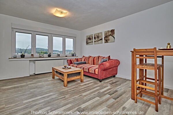 - Wohnzimmer: Heller, offener Wohnbereich mit direktem Zugang zur Loggia, die einen herrlichen Weitblick bietet, zum Entspannen einlädt und zum Wohlfühlcharakter beiträgt