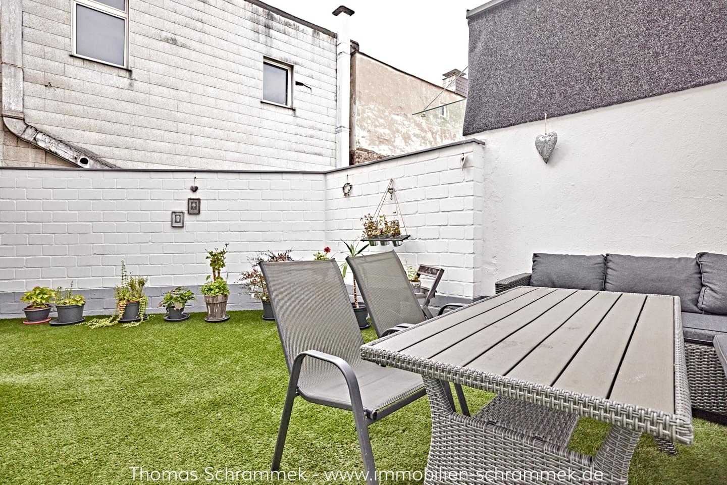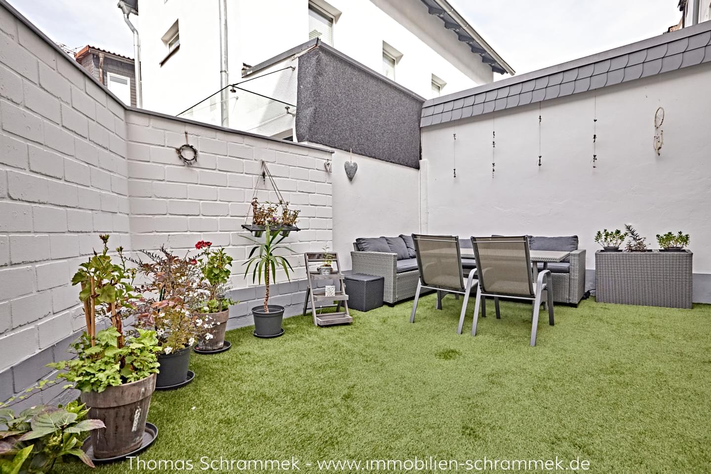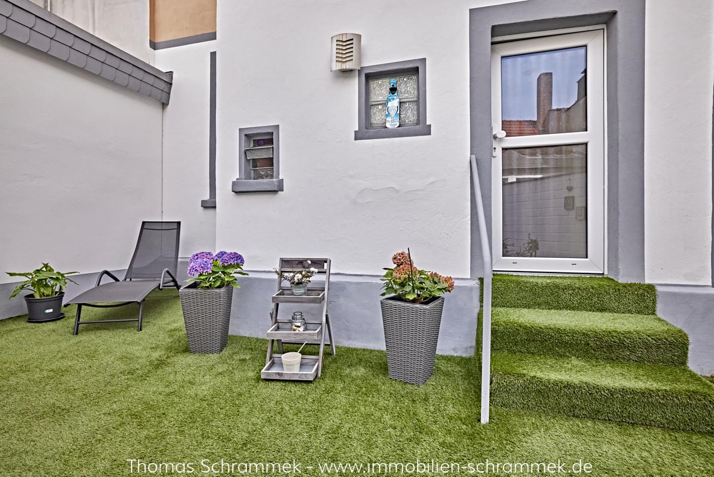 - Innenhof/Terrasse: Direkt vom Erdgeschoss aus erreichen Sie den rückseitig gelegenen Innenhof, der sich wie ein kleiner Garten nutzen lässt und das urbane Wohnen perfekt ergänzt. Der Bereich ist mit hochwertigem Kunstrasen ausgelegt und bietet dadurch eine pflegeleichte Alternative zum klassischen Grün – ideal für alle, die den Komfort eines Außenbereichs genießen möchten, ohne viel Aufwand für Gartenpflege zu haben. Ob für entspannte Stunden in der Sonne, einen gemütlichen Grillabend oder als geschützter Spielbereich für Kinder – dieser Hof schafft zusätzlichen Wohnraum im Freien und wird schnell zum Lieblingsplatz im Alltag. Trotz der offenen Gestaltung vermittelt der Innenhof eine angenehme Abgeschiedenheit vom Trubel der Stadt und bietet vielseitige Nutzungsmöglichkeiten mitten im Zentrum.