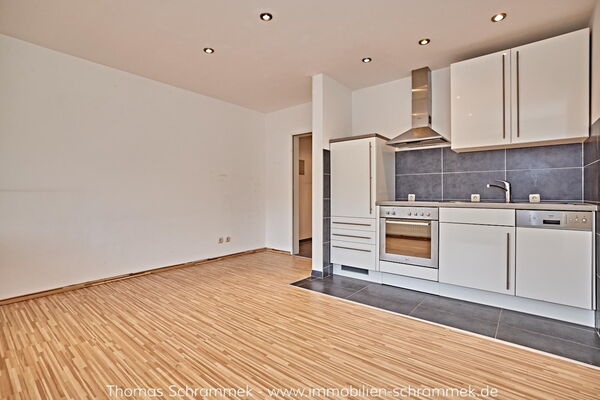 - Wohn-Schlafraum mit offener Küche: Der gut geschnittene und geräumige Raum bietet Platz für die unterschiedlichen Bereiche. In einer Nische findet eine hochwertige Markenküche mit weißen Lackfronten ihren Platz und bietet einen perfekten Kontrast zur anthrazitfarbenen Feinsteinzeugfliese am Boden und am Küchenspiegelbereich. Schubladen mit Vollaus- und Softeinzug sowie die extra hohen Schränke mit Stabgriffen lassen keine Wunsche offen. Mit dem Umluft- Backofen mit Cerankochfeld und der geräumigen Spülmaschine macht Kochen gleich doppelt so viel Spaß.