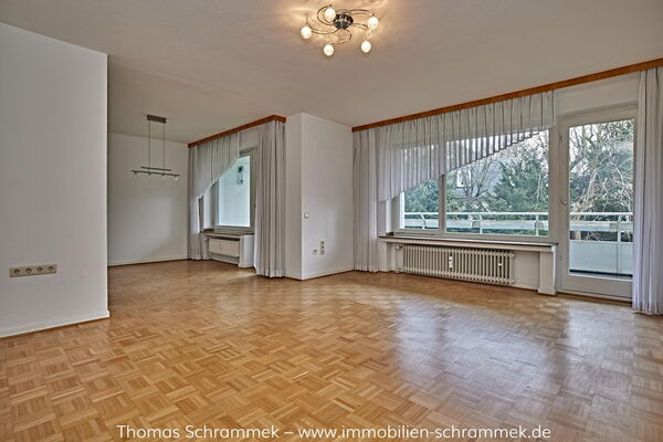 Der großzügig angelegte Wohnbereich, der mit einem einheitlichen und schönen Echtholzparkett versehen ist, bietet eine wohlige Atmosphäre. Das Wohn- und Esszimmer sind nebeneinander und offen zueinander angeordnet. Der fließende Übergang macht den Wohnbereich noch größer und schafft ein besonderes Wohngefühl. Beide Räume verfügen jeweils über einen Zugang zur großen Loggia, die einen herrlichen Ausblick in den Garten bietet und mit ihrer Größe punktet. Hier genießen Sie Ihre freie Zeit wind- und regengeschützt.