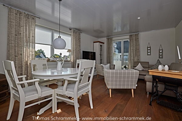 Über eine zentrale Diele mit Abstellraum und Gäste-WC erschließen sich Ihnen sämtliche Räume, direkt oder über einen weiteren Flur. Vom großzügigen Wohn-/Essbereich, der – wie alle anderen Wohnräume – mit warmen Echtholzdielen versehen ist, gelangen Sie auf einen Balkon, der Ihnen ausreichend Platz für eine kleine Sitzecke und/oder einen Tisch bietet, wo Sie wunderbare Sonnenstunden genießen können. Die Küche ist mit ihrer modernen, anthrazitfarbenen Einbauküche mit glänzenden Lackfronten und dem integrierten kleinen Essbereich ein echter Hingucker und ebenfalls direkt von der Diele aus begehbar.